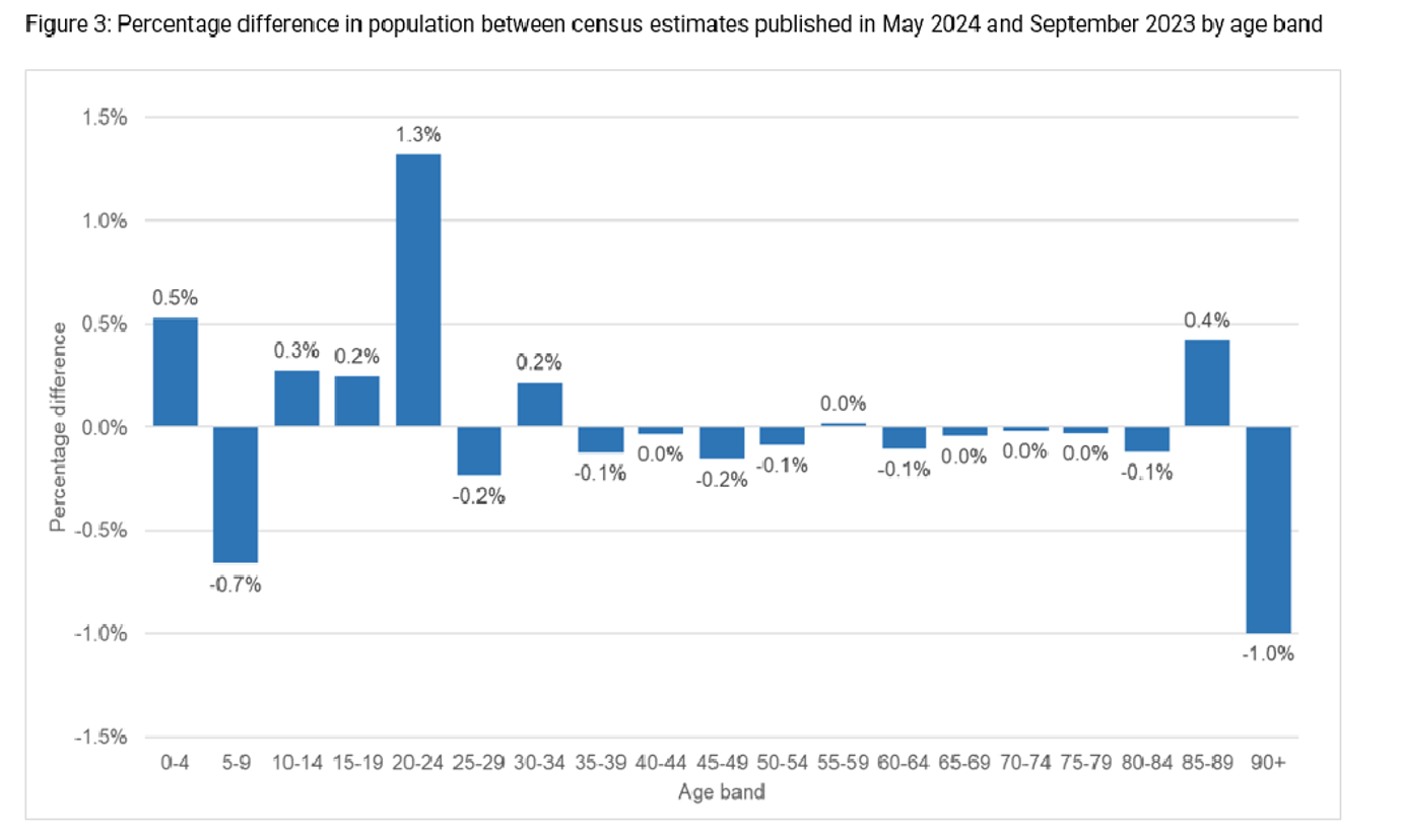 The increase in the population estimate from September 2023 also varies by age band. The change for most age bands is less than 0.5%. The biggest increase within an age band is 1.3% for those aged 20-24, whereas the biggest decrease is 1.0% for age 90 and over. Figure 3 shows the differences from the September 2023 estimate by 5 year age band.