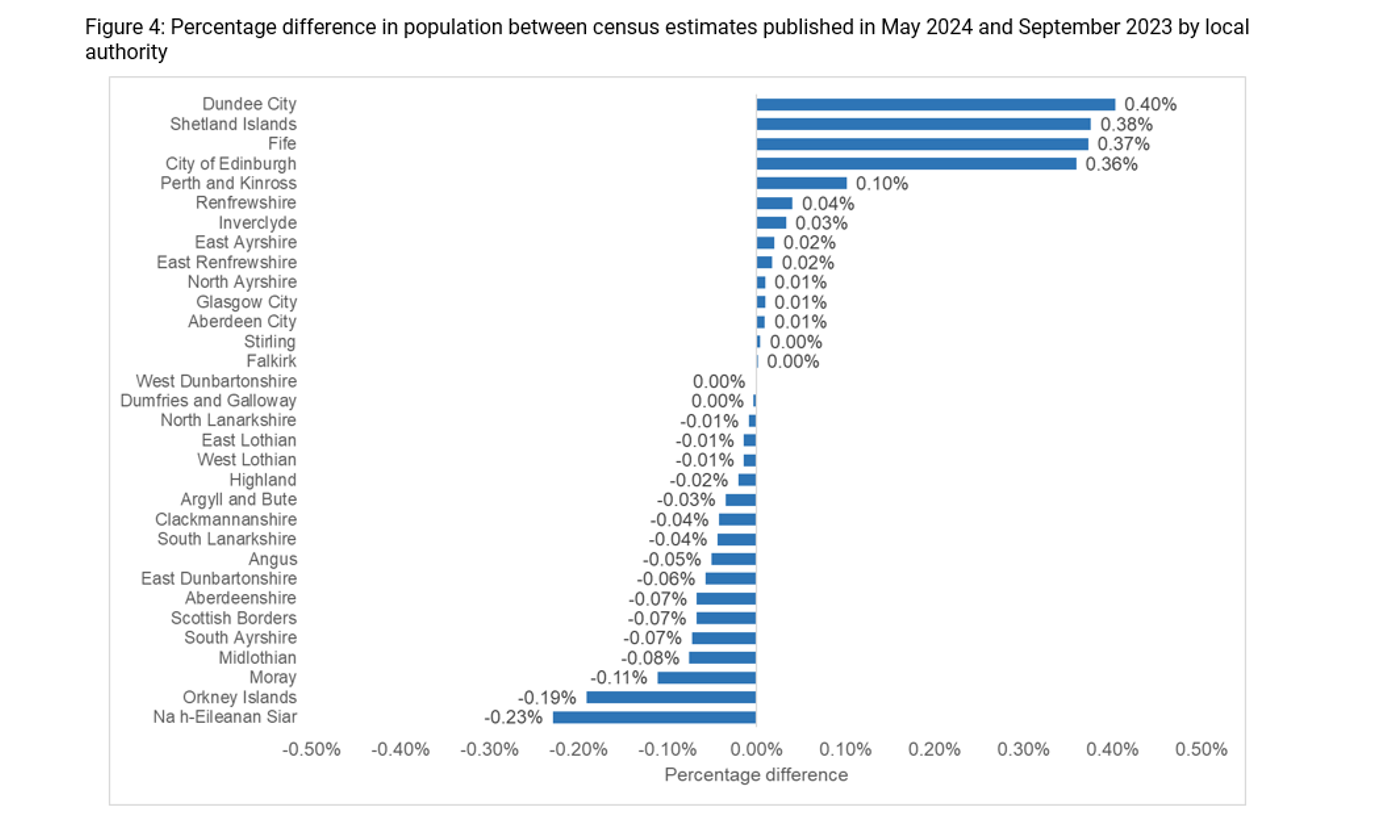 The difference from the estimates published in September 2023 is less than 0.1% for 24 of the 32 local authorities. Some of these differences are due to rounding, but they also include changes to the communal establishment population. The biggest increases from the September 2023 estimates are in Dundee City (+0.41%), Fife (+0.38%), Shetland Islands (+0.37%), City of Edinburgh (+0.36%) and Perth and Kinross (+0.10%). The biggest decreases are in Na h-Eileanan Siar (-0.23%), Orkney Islands (-0.14%) and Moray (-0.12%). Figure 4 shows the difference for all local authorities.