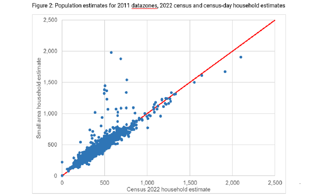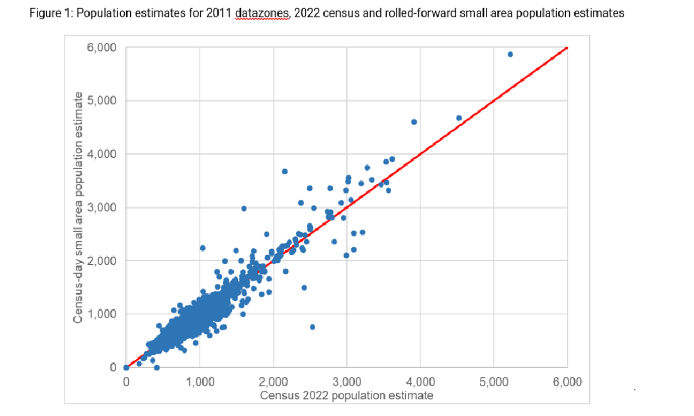 The 2022 census population estimates for 2011 datazones can be compared with the SAPE, which have been rolled forward from the 2011 Census. These population estimates are published every year, adding births, subtracting deaths and applying net migration to the previous year’s population. Reasons for potential differences between census and population estimates for Scotland and council areas are available in a reconciliation report published on the NRS website. Figure 1 is a scatterplot, showing the 2022 census population estimate and SAPE estimate for each 2011 datazone, shown as a dot on the chart. If a dot lies on the red line, then the 2022 census population estimate and SAPE estimate are the same.