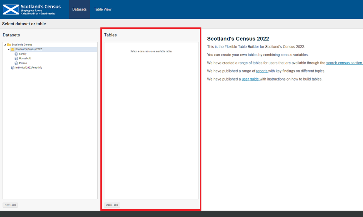 To build your own table, click once on the dataset you wish to use, and a list of pre-built tables will appear in the Tables section. You can then select the table you are interested in from this list and double click it to open it.