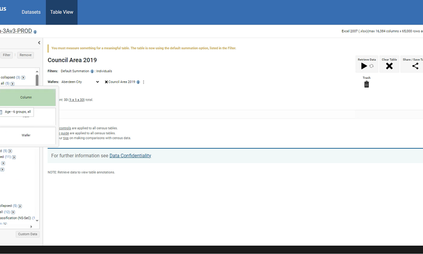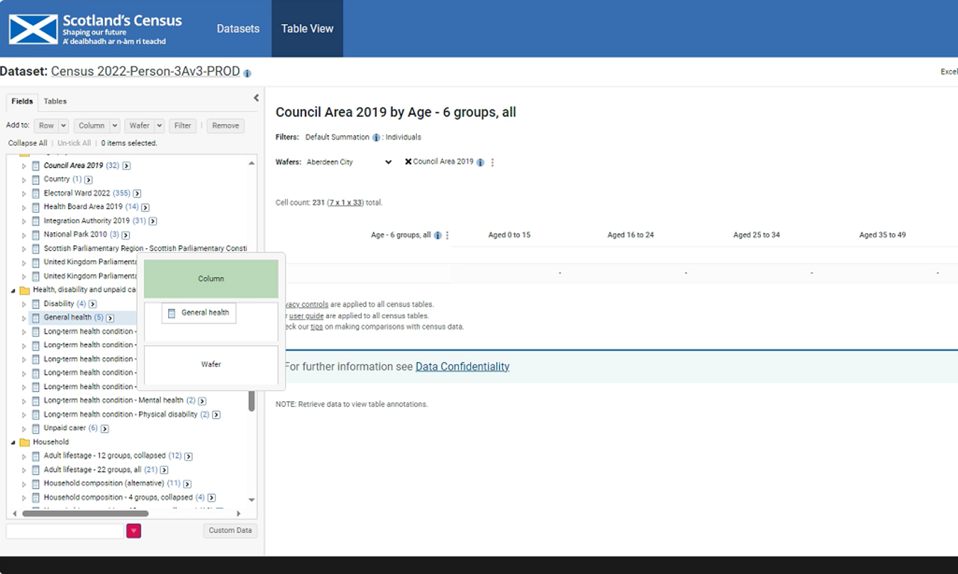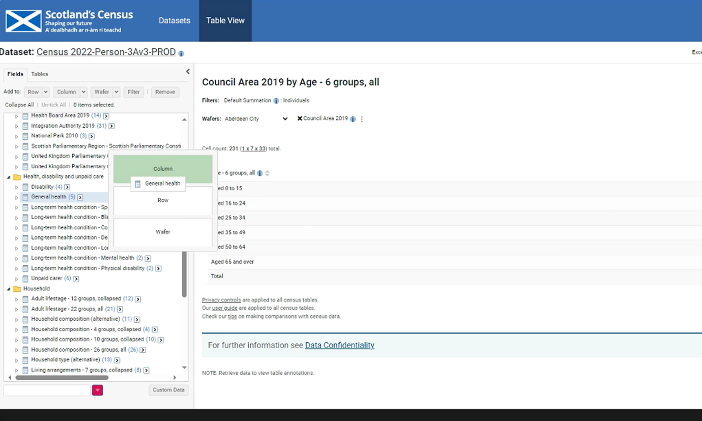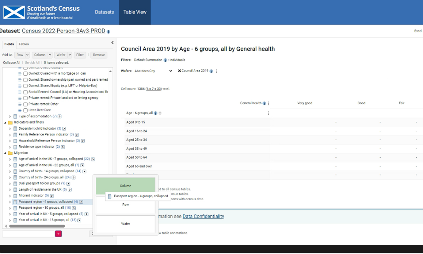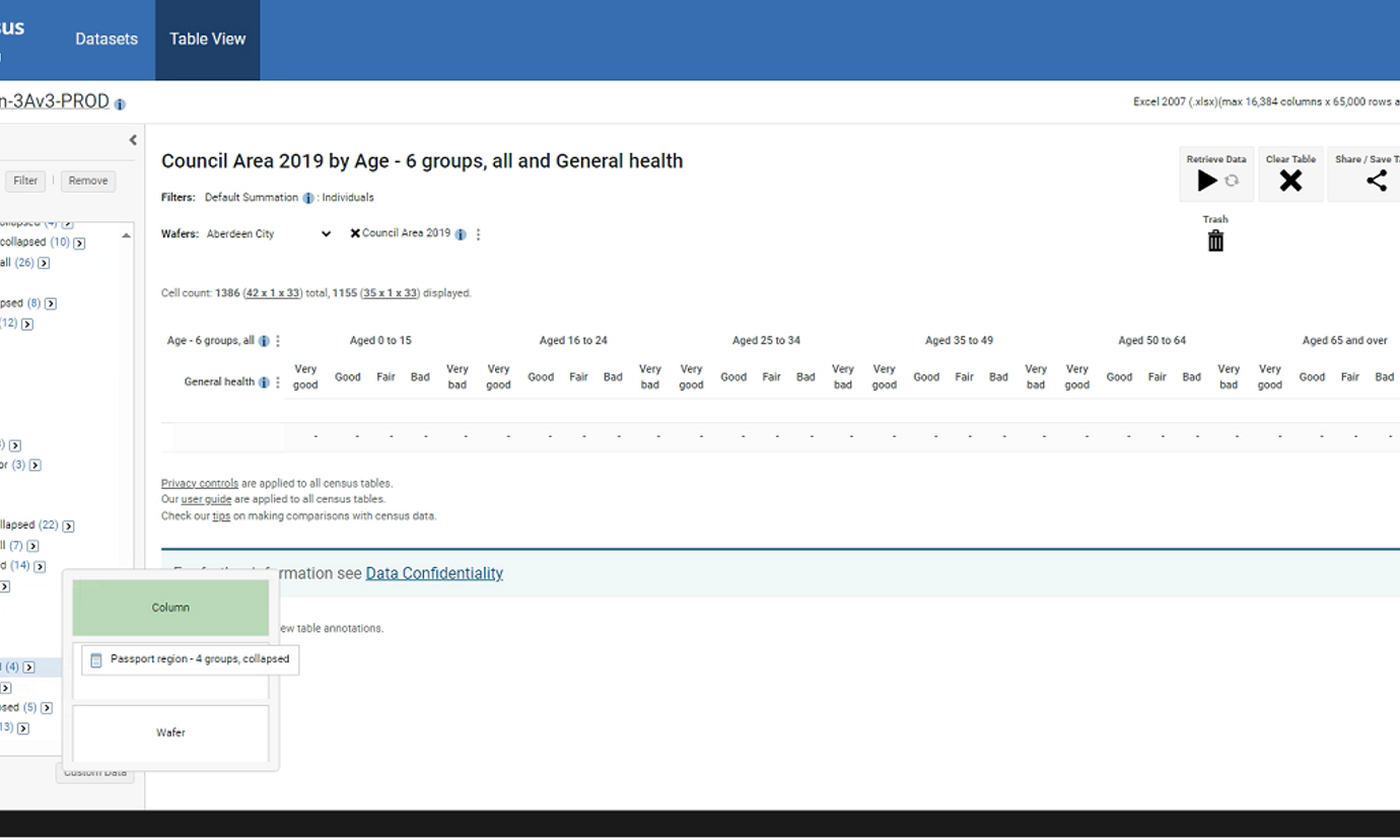 In this tutorial we will be examining how to build a table that combines variables as a wafer and columns. As our example we will be building a table that allows us to examine Passport Region by Age, by General Health and by Council Area, using data from the person dataset.