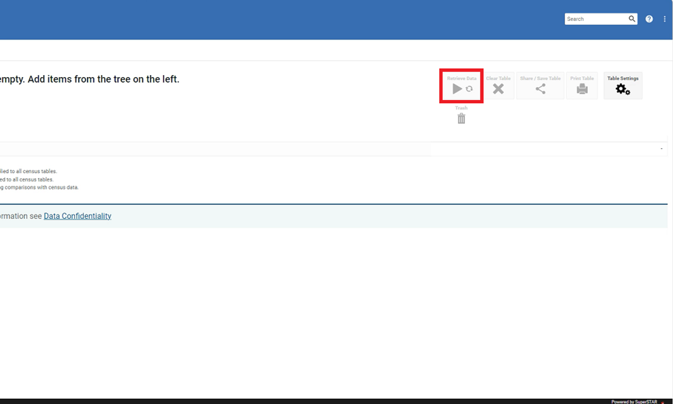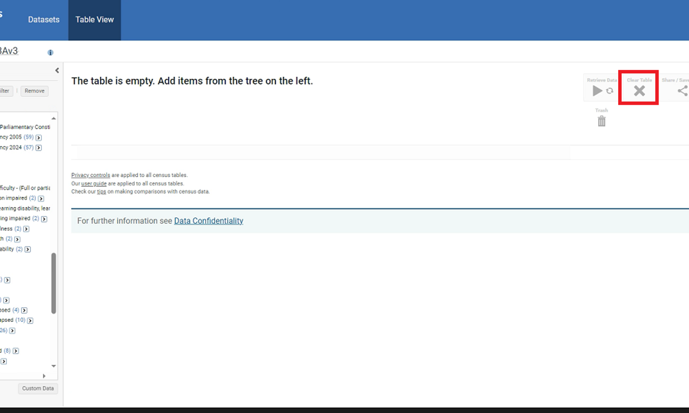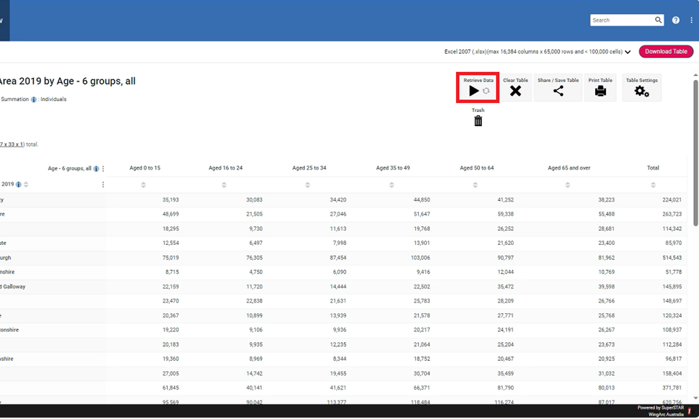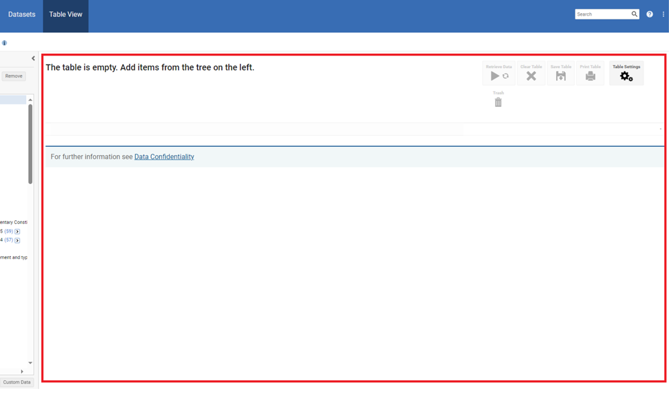 Retrieve Data – once you have selected the variables you wish to use in your table through the dataset manager, click this button to have the table viewer load the data for those variables.