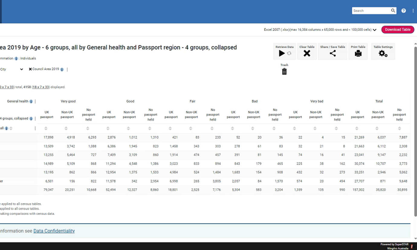 In this tutorial we will be examining how to build a table that combines variables as rows and columns. As our example we will be building a table that allows us to examine Passport Region by Age by General Health and by Council Area, using data from the person dataset.