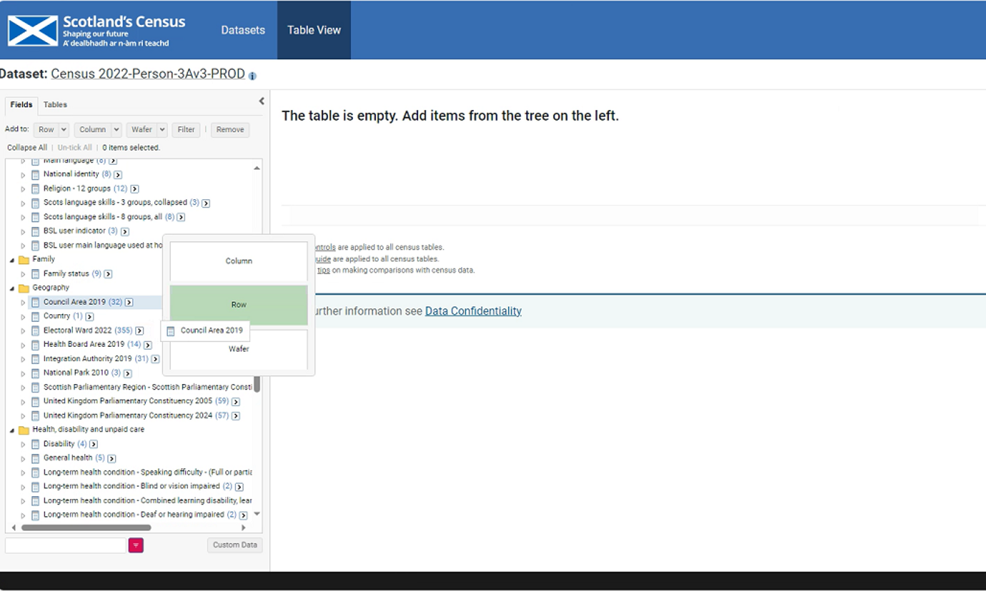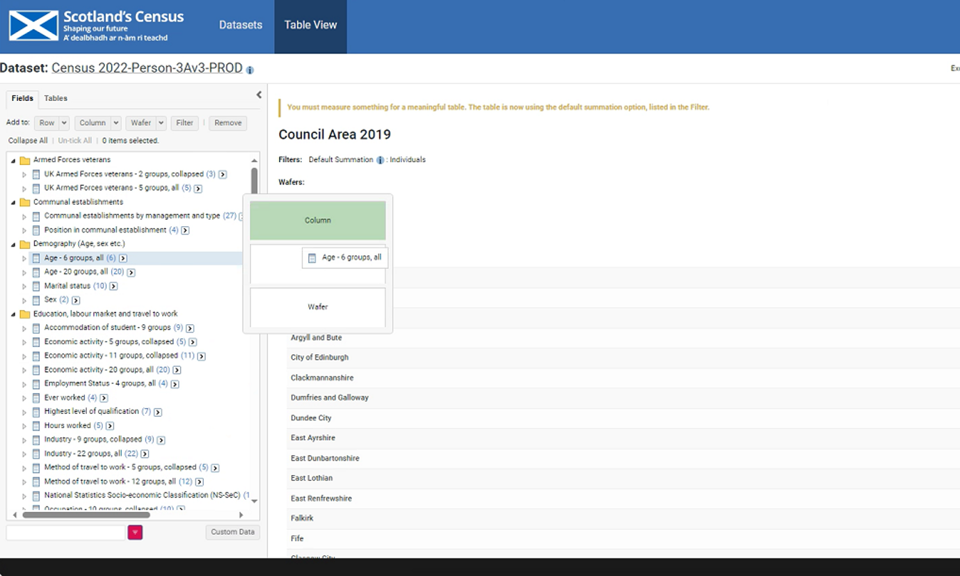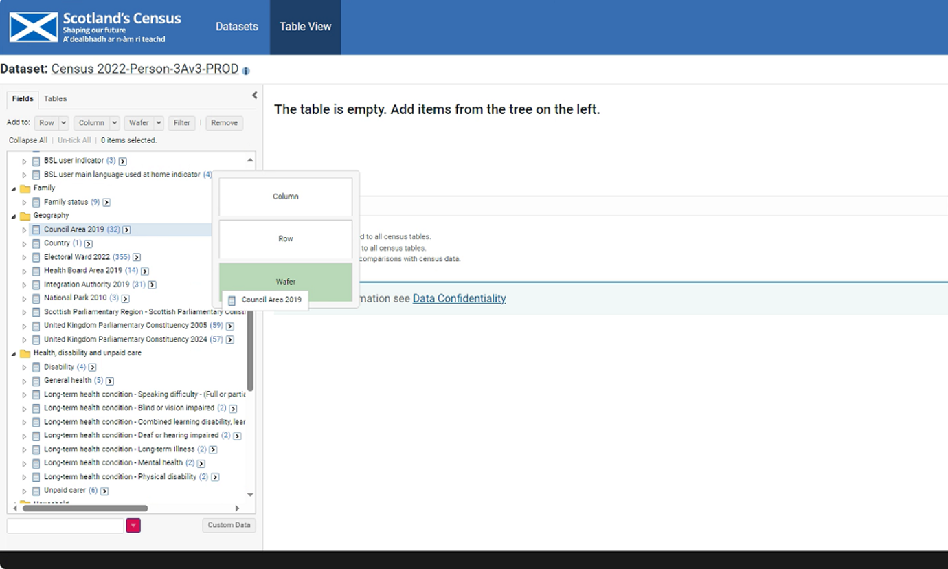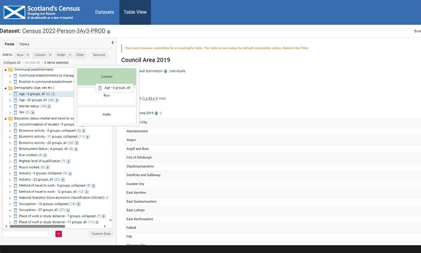 Once you have selected the person dataset and opened the table manager, drag the Council Area variable into wafer.