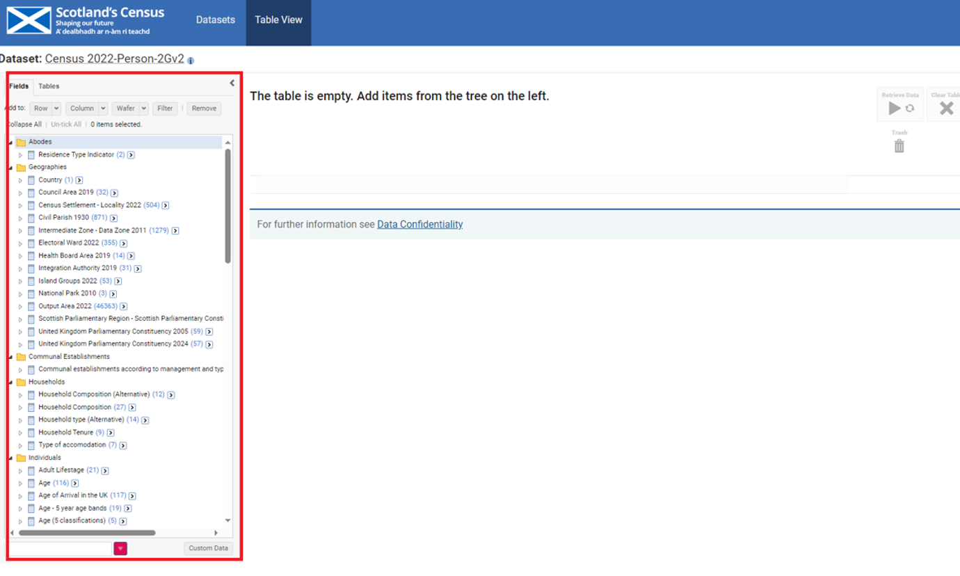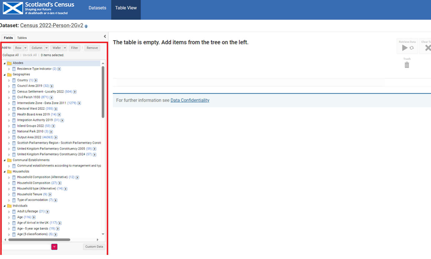 The table builder comes with several preset geographies of varying sizes, which can be further customised by users to suit their requirements. To demonstrate this, we will be building a custom geography of Electoral Wards contained within the City of Edinburgh local authority.