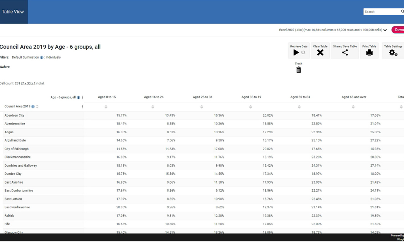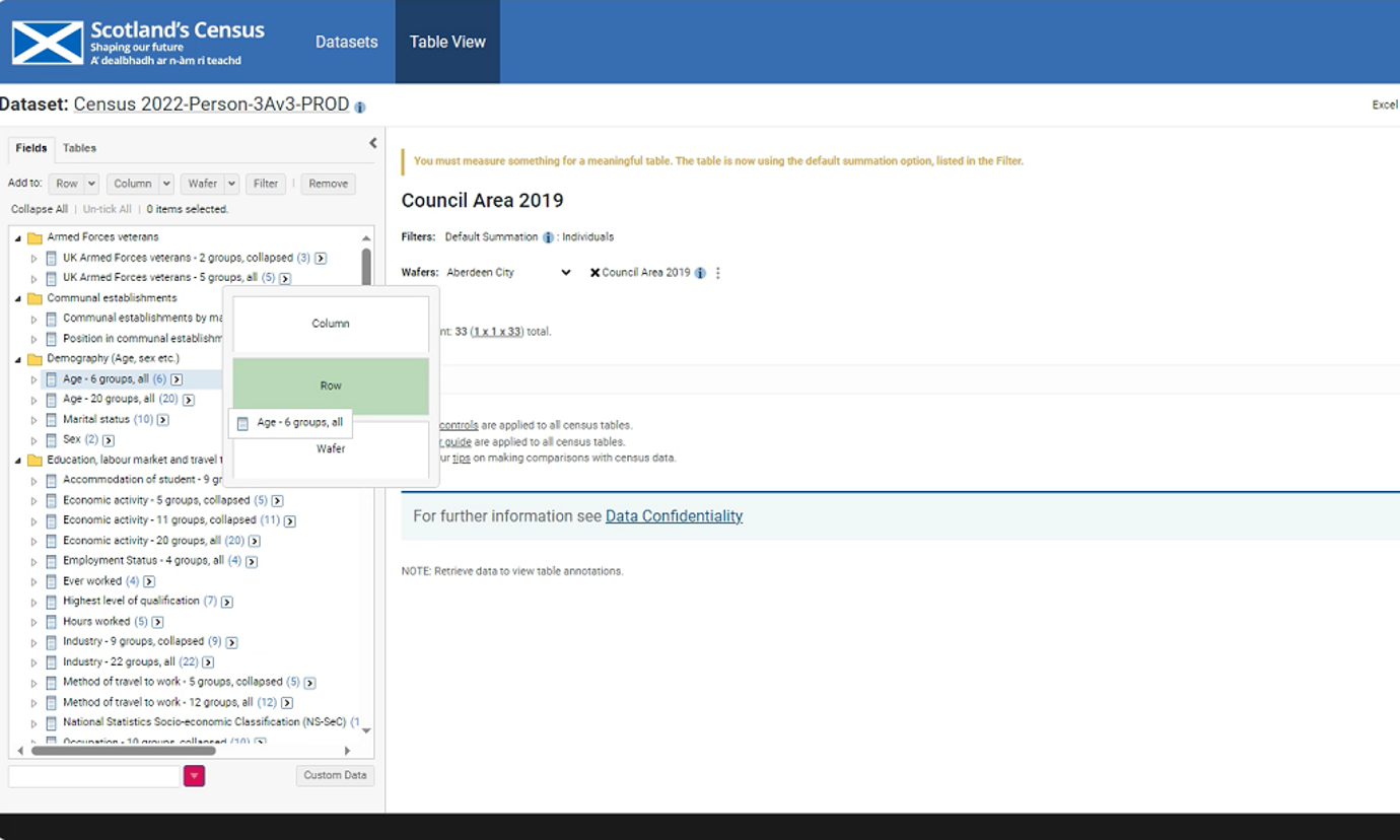 In this tutorial we will be examining how to use table settings to change our data being displayed as counts of people, to being displayed as percentages. To accomplish this, we will be using the Council area and Age (5 classifications) variables from the person dataset and examining the percentage of people in each age classification for each council area.
