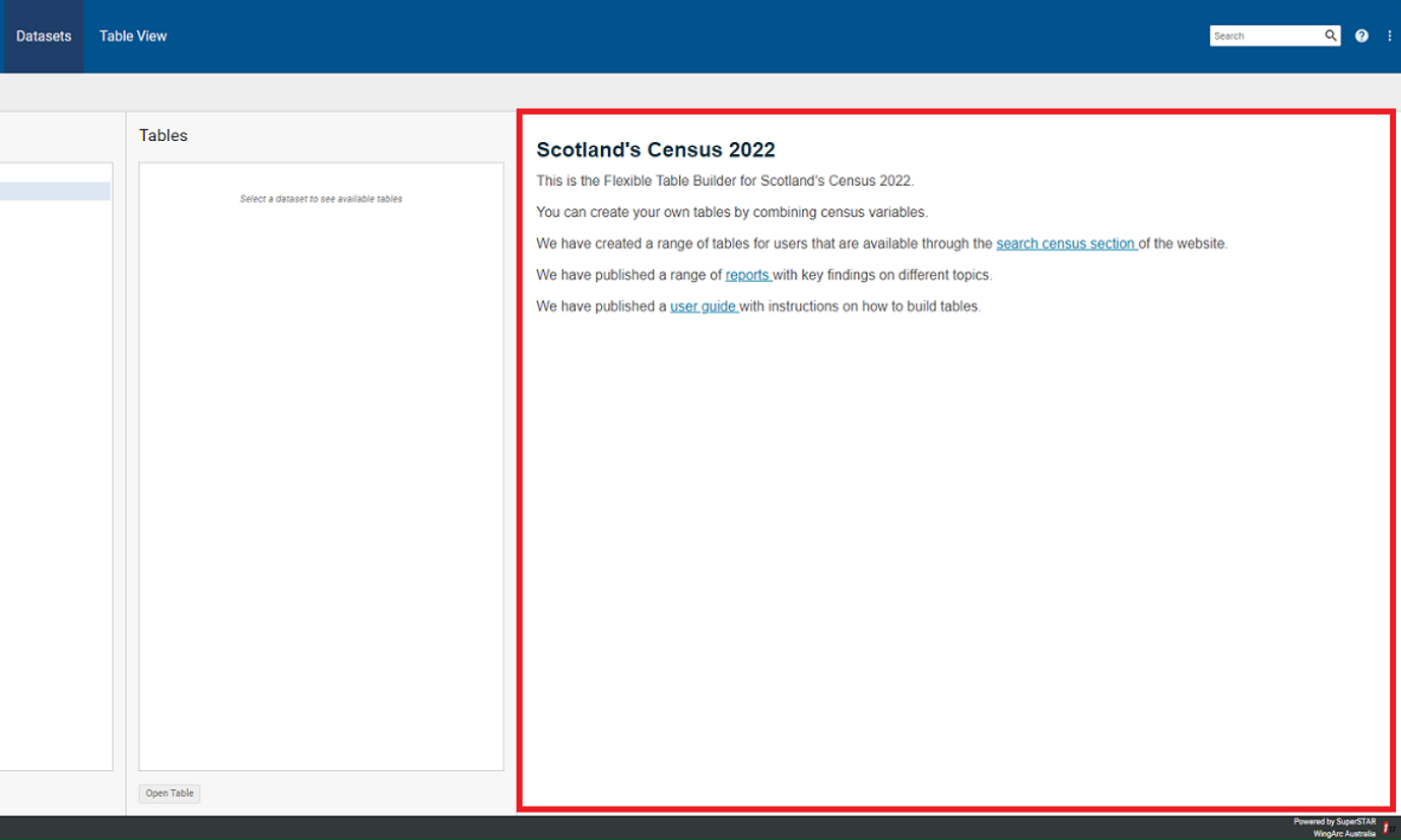 After launching the table builder and agreeing to the user agreement you will be brought to the flexible table builder catalogue explorer page. This page has three sections: