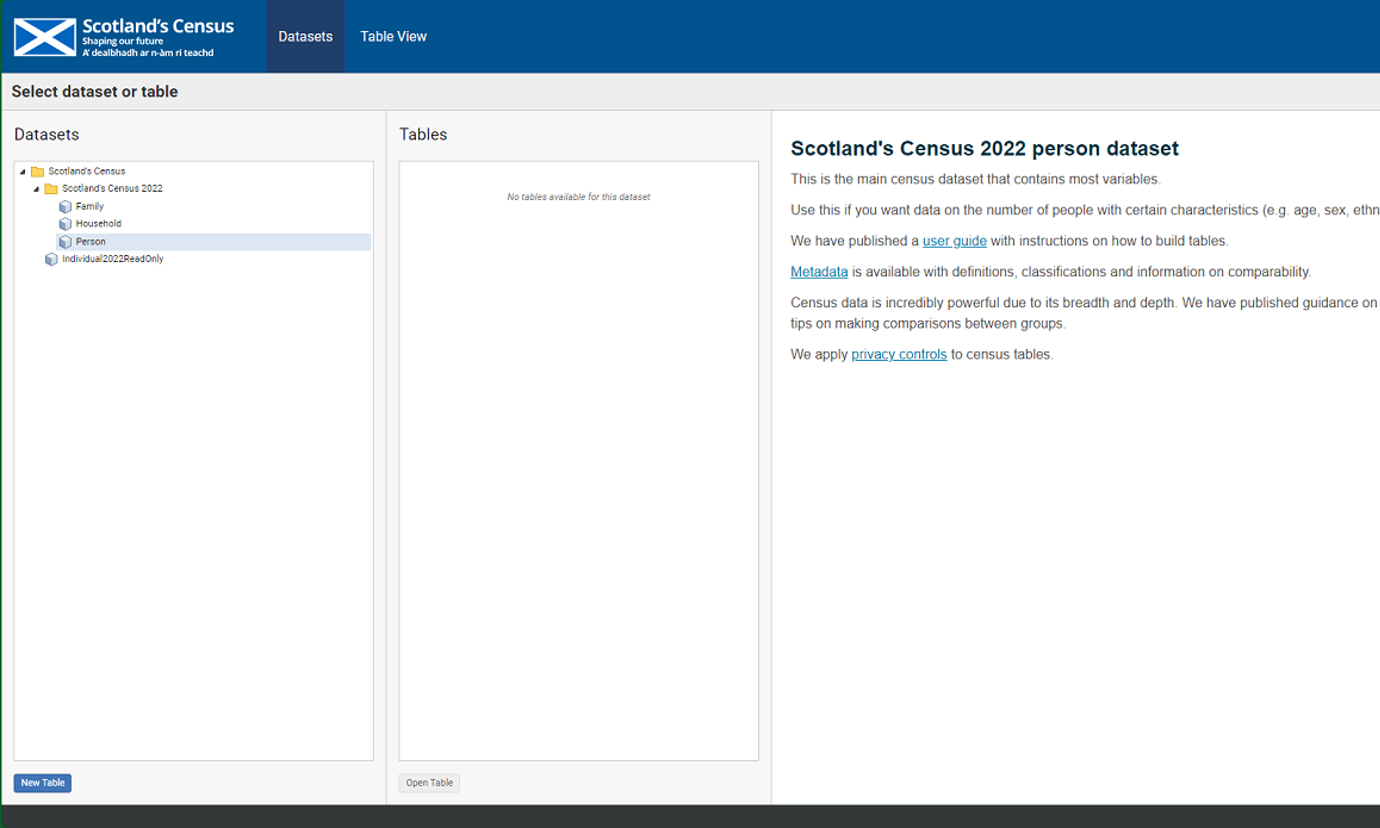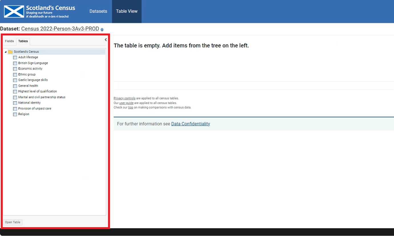 Tables – this is a section similar to the tables section from the catalogue explorer page, from which you can select pre-built tables that use the variables from this dataset