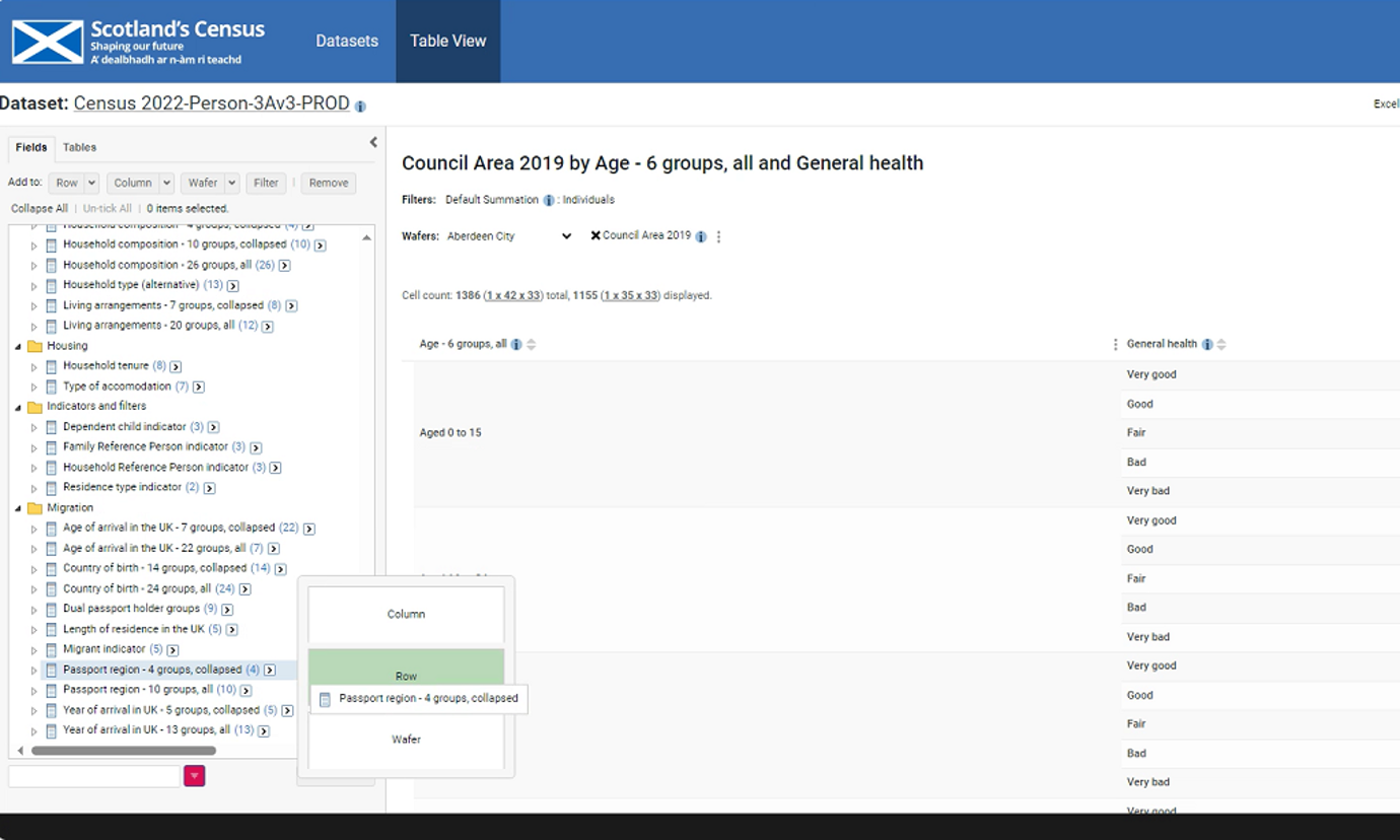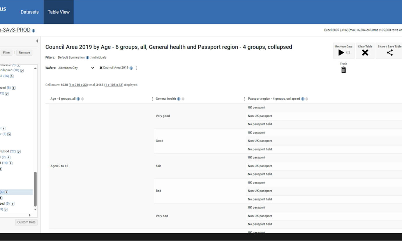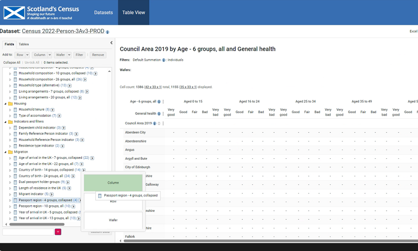 In this tutorial we will be examining how to build a table that combines variables as a wafer and rows. As our example we will be building a table that allows us to examine Passport Region by Age, by General Health and by Council Area, using data from the person dataset.