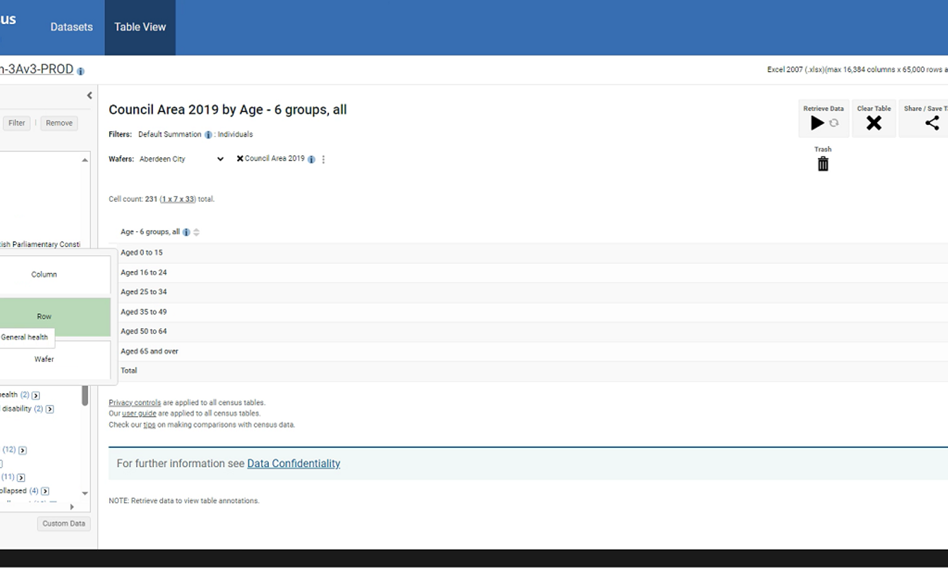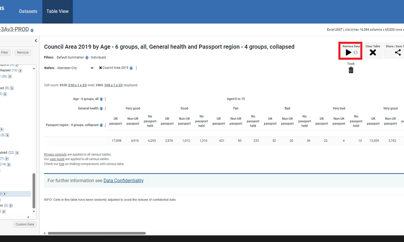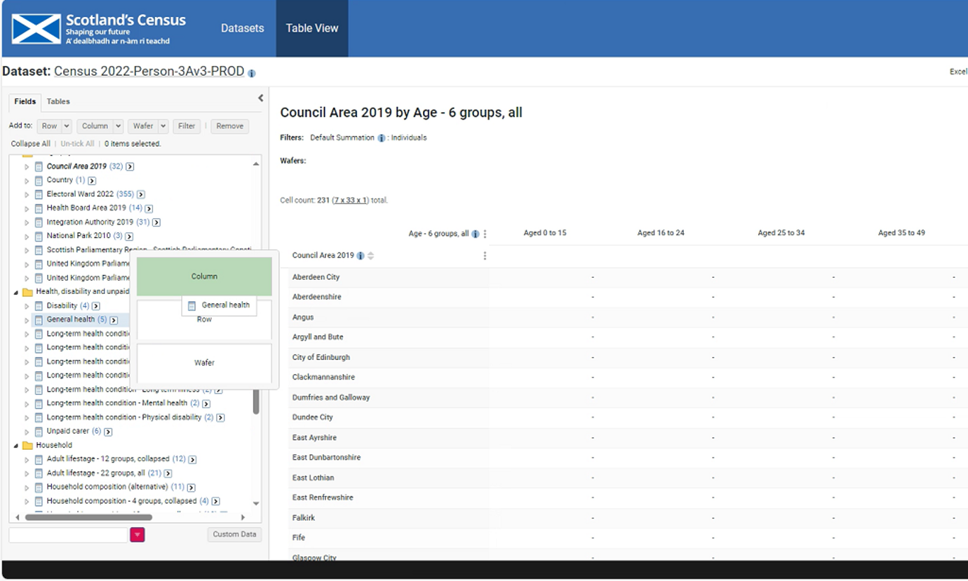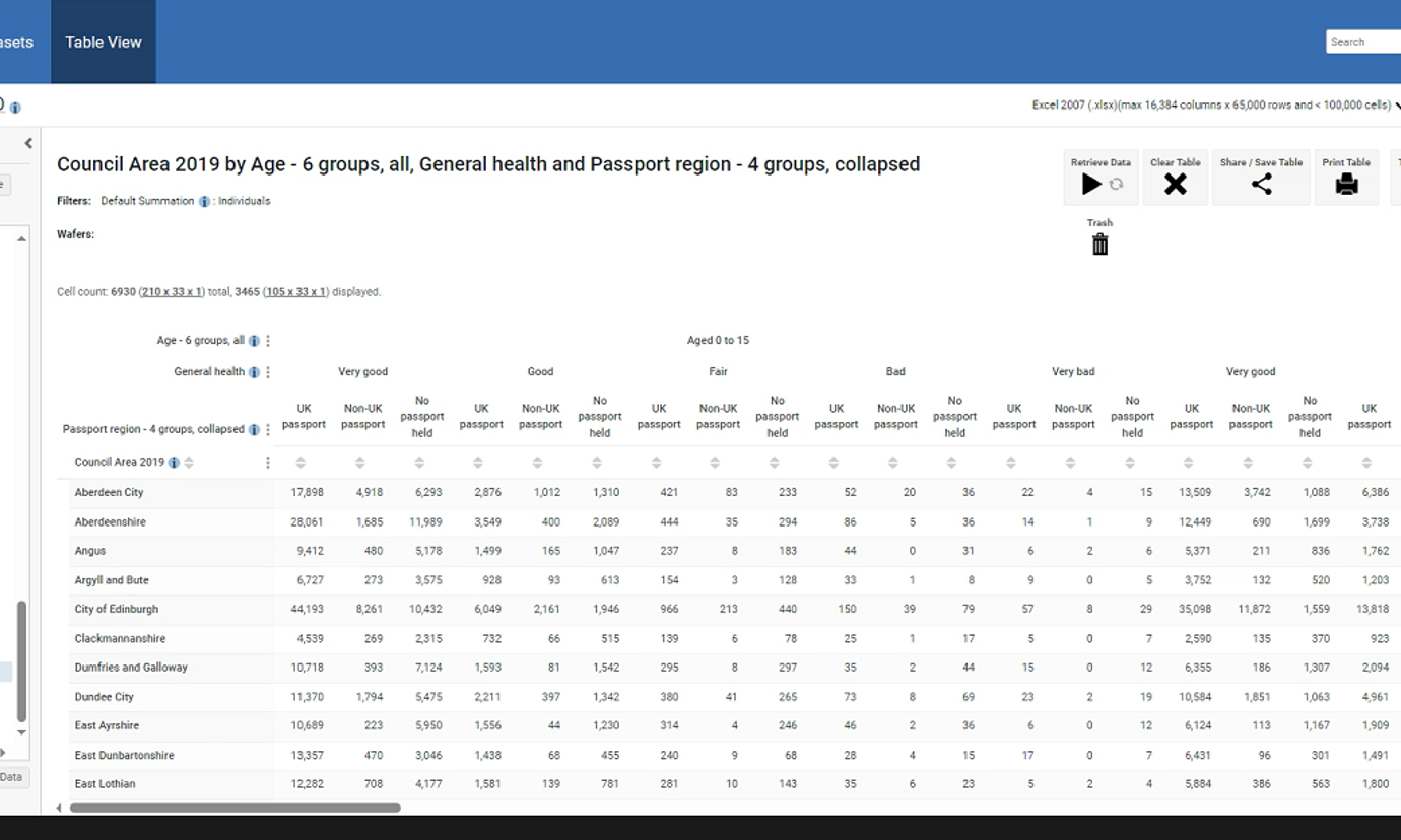 In this tutorial we will be examining how to build a table that combines variables as a wafer and rows. As our example we will be building a table that allows us to examine Passport Region by Age, by General Health and by Council Area, using data from the person dataset.