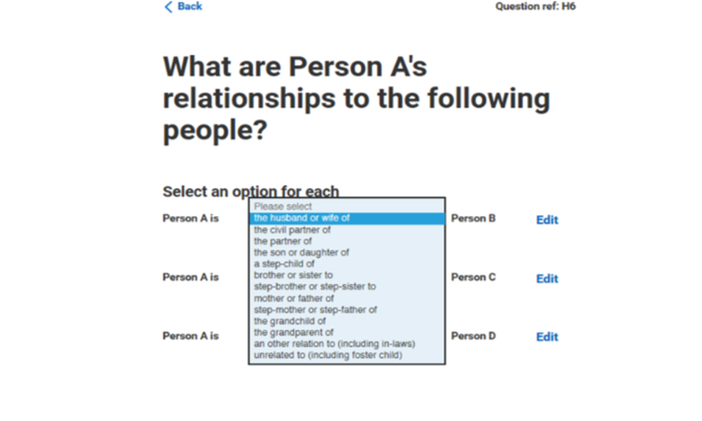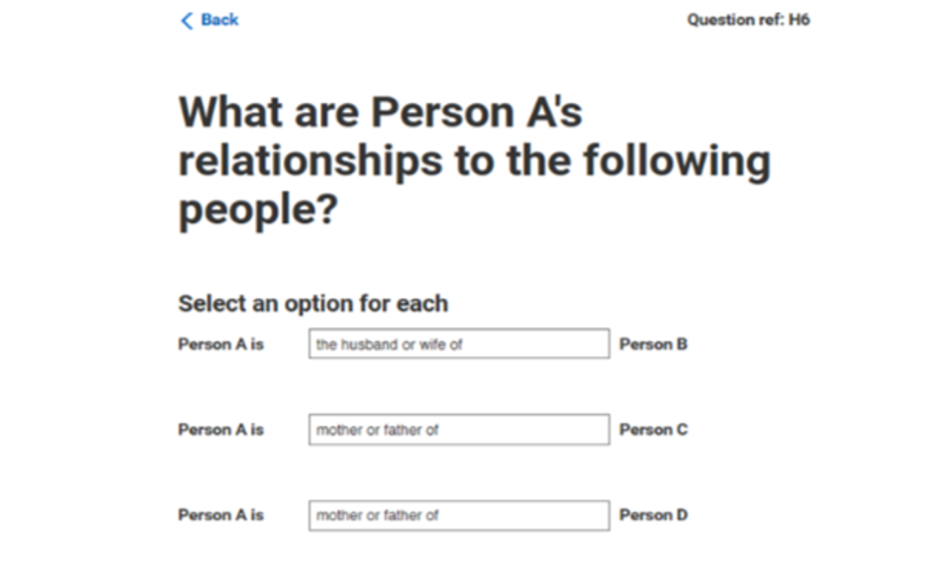The Census questionnaire includes a relationship matrix allowing each individual to indicate their relationship with all other individuals in the household. The online version of the relationship matrix used in 2022 was a big improvement from 2011. The 2022 version allowed an individual’s name to be visible when completing the matrix, preventing confusion between people in the household and mistakes.